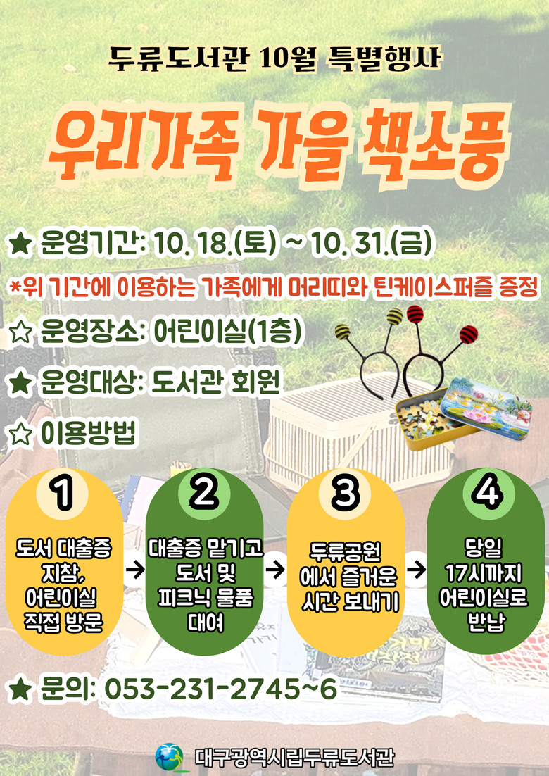기타 자세한 내용은 도서관 누리집(library.daegu.go.kr/duryu) 또는 어린이실(☎231-2745~6)로 문의하면 된다.