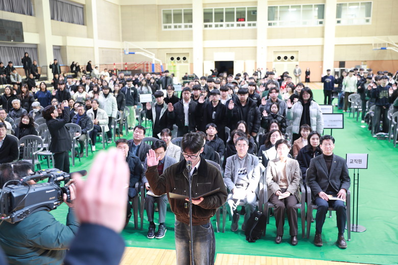 신입생 대표로 나선 전기전자공학과 김우진 학생은 이날 선서를 통해 “학생으로서 긍지와 자부심을 가지고, 학칙을 준수하며 학업에 전념하여 국가와 지역사회 발전에 이바지할 것을 엄숙히 선서한다”고 말했다.