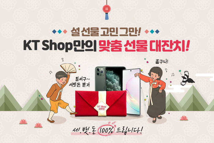 KT샵에서 설 맞이 프로모션을 진행한다. 프로모션은 ‘KT Shop 세뱃돈 받고 새 핸드폰 장만하자’ 와 ‘2020 설 선물 특별전’으로 구성됐다.