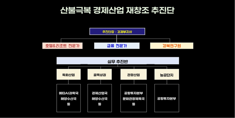 2조원이 넘는 프로젝트들의 실행력 확보를 위해 양금희 경제부지사를 단장으로 민관합동 “산불극복 경제산업 재창조 추진단”을 구성하고 활동에 들어갈 예정이다. 추진단은 특화산업, 농공단지, 골목상권, 관광산업 등 4개 분과로 나누어 운영될 예정이며 민간투자활성화를 위한 금융자문그룹과 경북연구원을 주축으로 연구지원그룹이 지원조직으로 활동할 예정이다.