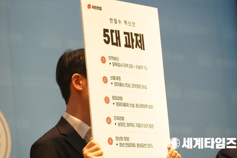 국민의힘 당권주자인 '안철수' 의원이 28일 서울 여의도 국회 소통관에서 인적쇄신 방안 등 당 혁신안을 발표하고 있다.