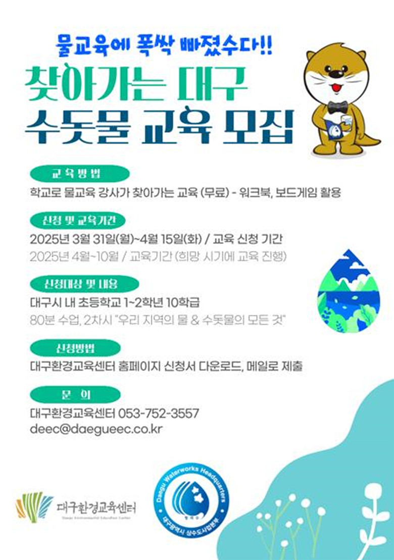 교육 내용은 ▲ 대구 수돗물 ‘청라수’의 원수인 낙동강 이해, ▲ 기후위기 시대, 수돗물의 환경적 가치 등을 중심으로 구성되며, 총 2차시 수업으로 진행된다.