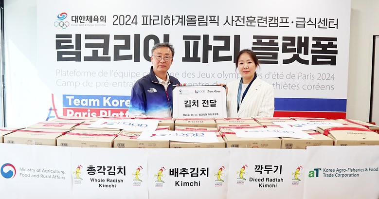 [세계타임즈 = 이현진 기자] 한국농수산식품유통공사(사장 김춘진)는 현지시간 7월 31일 프랑스 퐁텐블로시에 위치한 팀코리아 파리플랫폼에서 ‘국산 김치 전달식’을 갖고 대회 마지막까지 태극전사들의 건강한 선전을 기원했다.