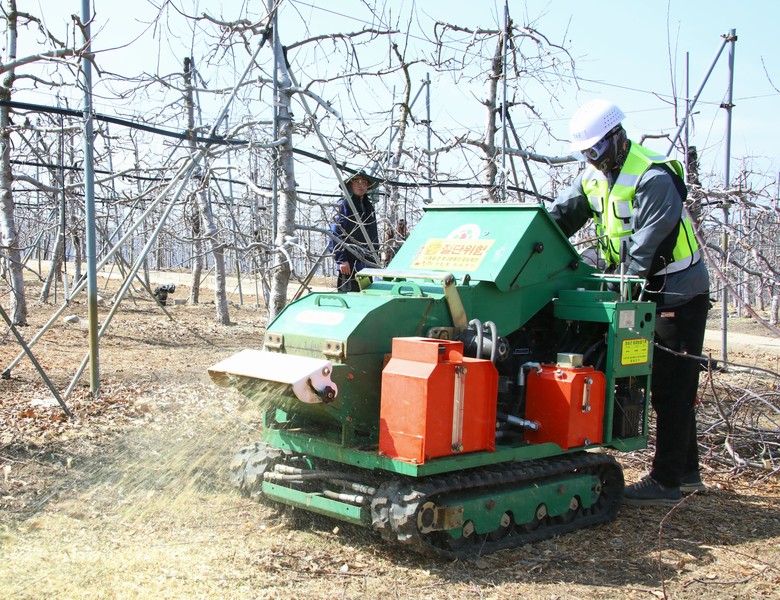 이어서 황금사과연구단지에서 영농부산물 파쇄 작업 연시회를 열고, 파쇄기 전시 및 설명, 목재파쇄기와 트랙터부착형 파쇄기를 활용해 영농부산물의 퇴비활용 과정을 선보였다.