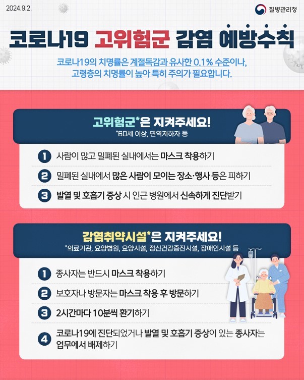 또한 고령층과 면역이 약한 고위험군은 사람이 많고 환기가 잘 안 되는 실내에서는 반드시 마스크를 착용하고 발열이나 기침 등 증상이 나타나면 즉시 병원을 방문할 것을 권고했다.