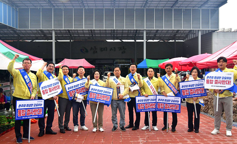 4일 완주군의회에 따르면 지난 3일 삼례읍 일원에서 의원 11명 전원이 참여한 가운데 완주·전주 행정통합 반대 캠페인을 벌였다.