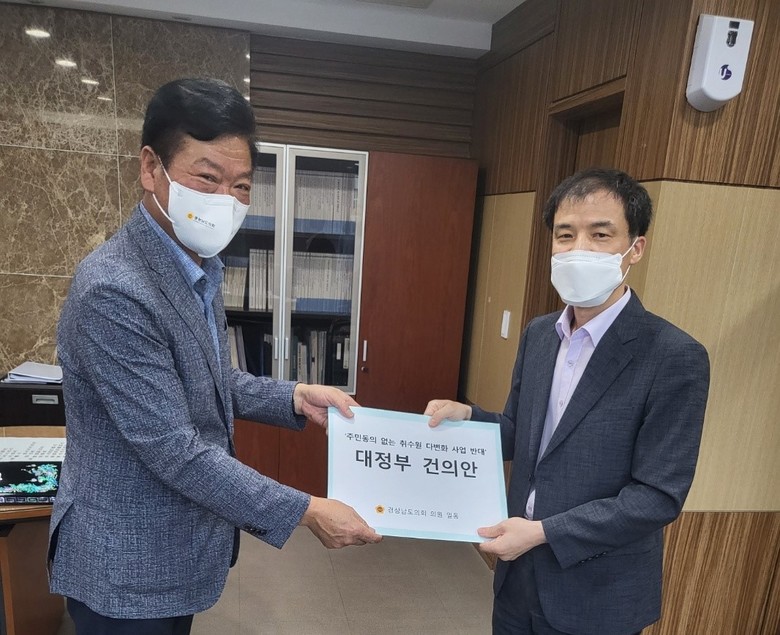 김일수 위원장은 대정부 건의문 전달과 함께“취수원 다변화 사업은 상수원보호구역 확대, 농업용수 부족 등 직접적 이해당사자인 창녕군·거창군·합천군 주민의 생존권과 재산권에 영향을 주는 중차대한 사안이므로 정치와 힘의 논리보다 주민의 삶과 생존의 문제로 주민들의 피해가 없도록 주민의견 수렴을 위해 민간 협의체 구성에 적극 나서 줄 것”과“도내 현안 사업의 원활한 추진을 위해 환경영향평가와 같은 각종 행정절차의 신속하게 이행될 수 있도록 적극적인 자세로 협의해 줄 것”을 건의했다.