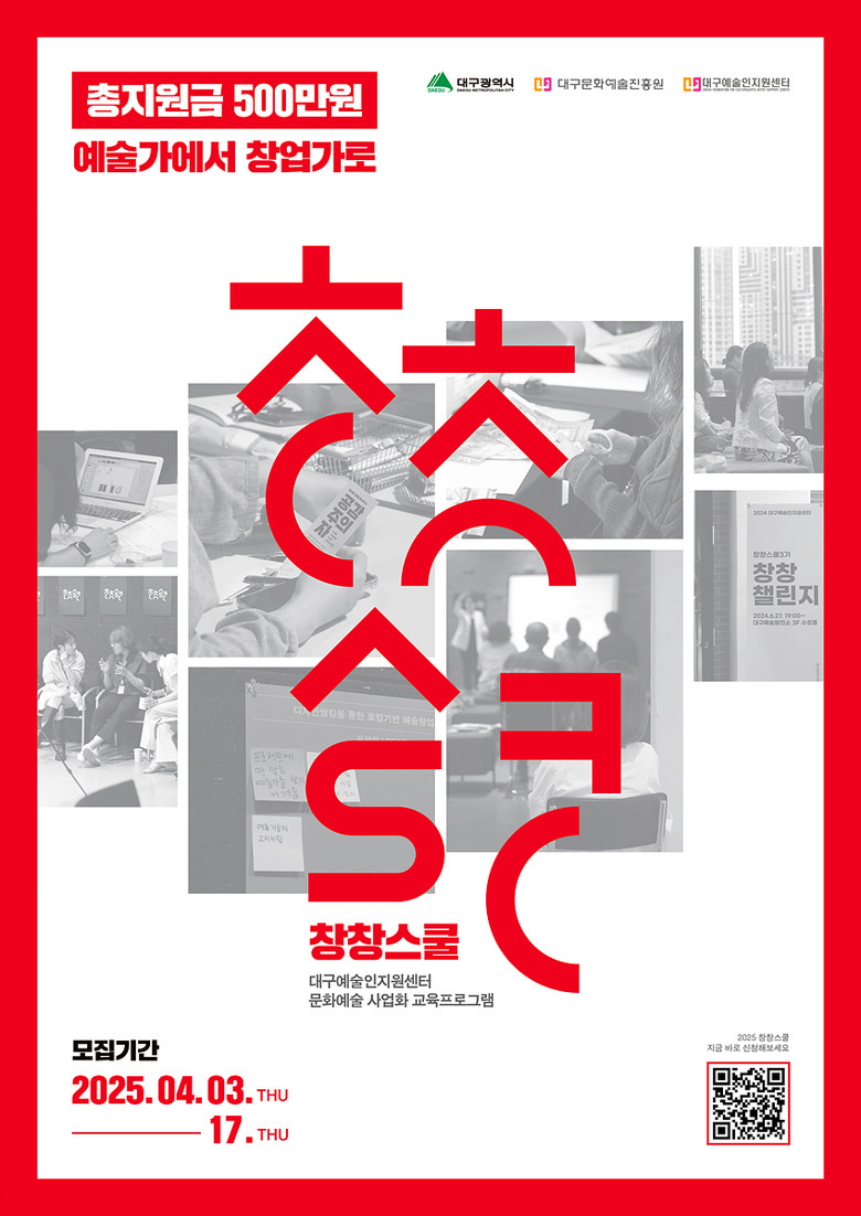 방성택 대구문화예술진흥원 문화예술본부장은 “지난해 모집 첫날 지원자가 마감될 만큼 ‘창창스쿨’은 지역 예술가들로부터 예술창업 교육의 대표 프로그램으로 인정받고 있다.