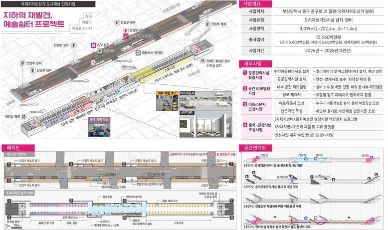 중구 광복·부평동 ‘지하의 재발견, 예술쉼터 프로젝트’는 국제지하도상가 내 부족한 화장실과 휴식 공간을 확충하고 공연·전시 등 문화 행사를 도입해 지역 활성화를 도모하는 사업이다.