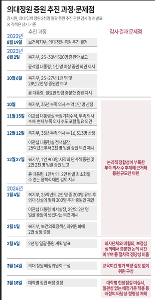 감사원은 이 가운데 증원 결정 및 정원 배정 과정을 우선 처리 분야로 정해 이날 결과를 발표했으며, 배정 이후의 추진 상황과 관련한 감사 결과도 추후 내놓을 예정이다.감사 과정에서는 이관섭 전 대통령 비서실장, 장상윤 전 사회수석비서관, 복지부의 조규홍 전 장관 및 박민수 전 차관 등에 대한 대면 조사가 이뤄졌다. 윤 전 대통령이나 김건희 여사는 조사 대상에 포함되지 않았다.일각에서는 이번 감사가 공직사회 위축을 막기 위해 정책감사를 폐지하겠다는 새 정부 방침과 어긋나는 것 아니냐는 지적도 제기된다.감사원은 "국회에서 국회법에 따라 감사를 요구한 것으로 정책감사 폐지와는 무관하다"며 "다만 정책 결정의 옳고 그름에 대한 판단은 하지 않고 어떤 논의를 통해 정책이 이뤄졌는지 국민이 궁금해하실 부분을 철저히 조사했다"고 설명했다.국회 요구가 있다면 유사한 감사를 계속할 것이냐는 질문엔 "이행 여부에 대해선 내부적으로 숙고해 나중에 따로 말씀드릴 기회가 있을 것"이라고 답했다.