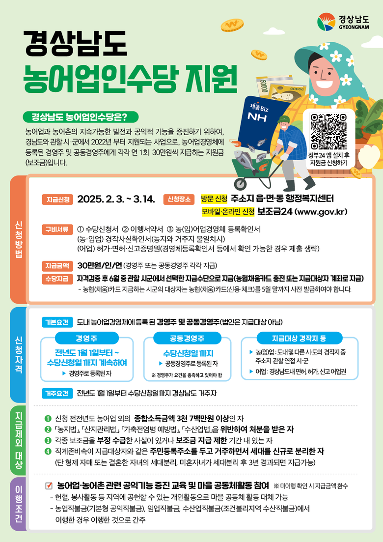 경상남도 농어업인수당은 농어업과 농어촌의 지속가능한 발전과 공익적 기능을 증진하기 위하여 지난 2022년부터 지원해 오고 있으며, 경영주 및 공동경영주에게 각각 30만 원을 지급한다.