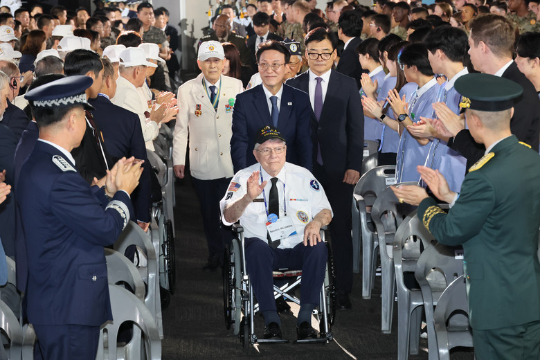 김 총리는 "전쟁의 상흔을 딛고 대한민국은 위대한 도약을 이뤄냈다. 경제는 선진국 반열에 올랐고 'K-문화'와 'K-민주주의'는 전 세계가 주목하고 있다"면서도 "75년 전 유엔군의 희생과 우리의 노력에도 분단의 아픔은 진행 중"이라고 짚었다.'가장 확실한 안보는 싸울 필요가 없는 상태, 즉 평화를 만드는 것'이라는 이재명 대통령의 발언을 인용하며 "안보와 평화에 대한 책임을 다하겠다. 분열과 대립이 아닌 상생의 길로 나아가겠다"고 언급했다.기념식에는 해외 참전용사 5명이 직접 참석했다. 김 총리는 거동이 불편한 한 참전용사의 휠체어를 직접 밀며 행사장에 입장했고, 그의 옆자리에 앉아 손을 잡고 축하 공연을 보기도 했다.
