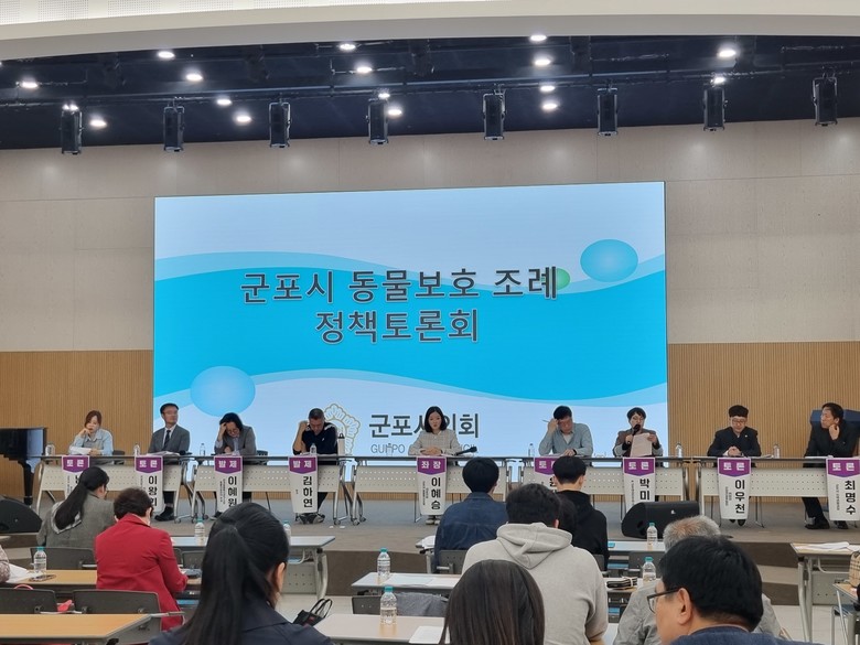 [세계타임즈 = 백진욱 기자] 11월 3일 오후 2시 군포시청 대회의실에서는 ‘반려동물과의 공생을 위한 조례 입법의 필요성과 제정 방안’ 등 반려동물 관련 정책 논의의 장이 열렸다. 이번 정책 토론회는 군포시의회 행정복지위원회(이혜승 의원)가 주최했다.