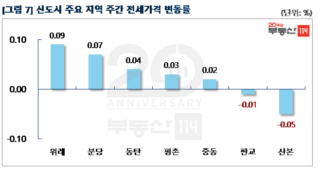 신도시는 △분당(0.10%) △위례(0.05%) △광교(0.04%) △평촌(0.02%) △판교(0.02%)가 올랐고 ▼산본(-0.06%)은 하락했다. 분당은 정자동 정든동아, 분당동 장안건영, 서현동 시범삼성·한신 등이 500만원-2,000만원 올랐다. 위례는 창곡동 위례센트럴푸르지오가 250만원-500만원 상승했다. 광교는 실수요자들의 거래가 간간히 이어진 원천동 광교호반베르디움이 250만원-500만원 올랐다. 판교는 판교동 판교원마을7단지가 소형 위주로 거래된 후 500만원 올랐다. 반면 산본은 거래절벽으로 산본동 가야5단지주공1차가 500만원 떨어졌다.