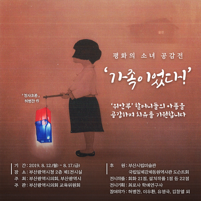 부산시의회는 오는 12일부터 17일까지 6일 동안 시청 2층 제1전시실에서 「평화의 소녀 공감전 ‘가족이었다!’」를 개최한다.