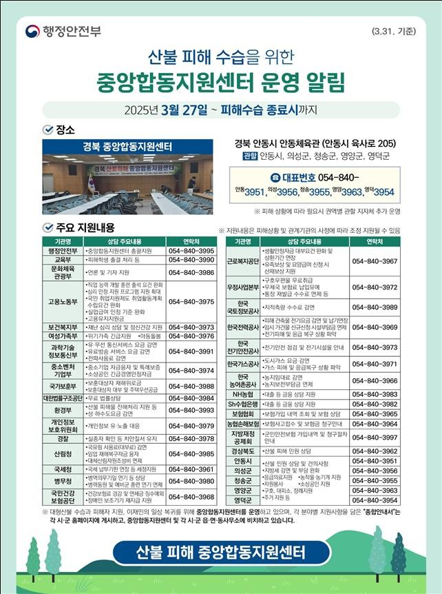 중앙합동지원센터는 행정안전부, 보건복지부, 금융기관, 지자체 등 43개 기관이 모여 구성되었으며, 관할지역은 이번 산불에 피해를 입은 안동시, 의성군, 청송군, 영양군, 영덕군이고, 피해수습 종료 시까지 운영할 계획이다.