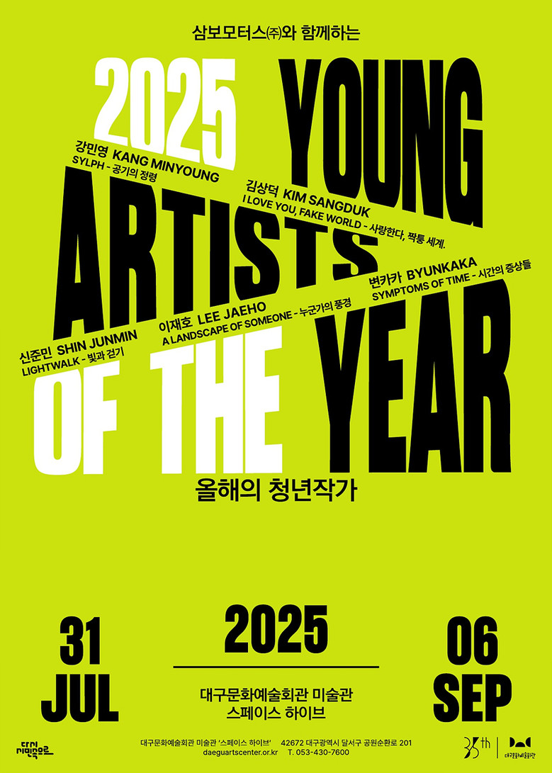 한편, ‘2025 올해의 청년작가’ 전과 연계한 프로그램 ‘작가와의 대화’ 시간을 마련한다. 8월 23일(토) 오후 3시에 ‘2025 올해의 청년작가’ 5명과 함께 작가의 작품과 전시에 대한 이야기를 자유롭게 할 수 있는 시간이 마련된다. 참가 신청은 7월 31일(목)부터 대구시 통합예약시스템(yeyak.daegu.go.kr)에서 가능하다.