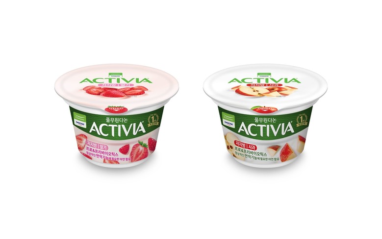 신제품 2종은 '액티비아 컵 사과(150g)'와 '액티비아 컵 딸기(150g)'이다.