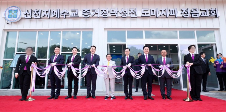 13일 신천지예수교 증거장막성전 이만희 총회장이 신천지 정읍교회를 방문해 최중일 도마지파장, 지역 담임강사들과 함께 테이프 컷팅식을 하고 있다.