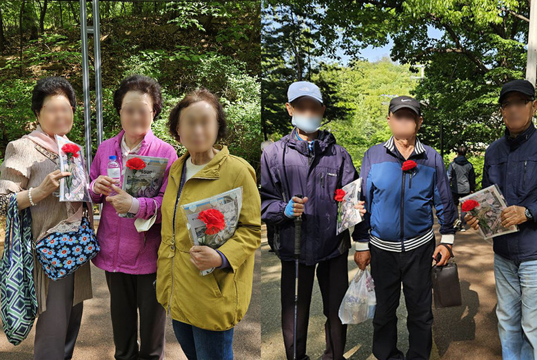 이러한 사회적 흐름 속에서 가정의달을 맞아 어르신들에게 감사의 마음을 전하는 따뜻한 나눔 행사가 열렸다. 신천지예수교 증거장막성전 바돌로매지파 화곡교회(담임 유영빈·이하 신천지 화곡교회) 홍보단은 5월 8일 어버이날을 맞아 우장산 둘레길에서 산책 중인 어르신들에게 카네이션을 전달하며 존경과 사랑의 마음을 전했다.
