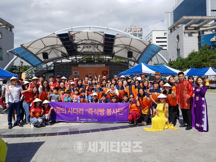 [대전=세계타임즈 이장성 기자] 다양한 봉사활동을 하고 있는 5천명 봉사 빅밴드 사랑의 사다리 밴드(리더 이정제)가 17일 오전 9시부터 2017년 제4회 베트남 문화축제 행사(우리들 공원)에서 사랑의 즉석 빵 600개를 직접 만든 후 전달하면서 한국사회의 따뜻한 정을 보여 주었다.