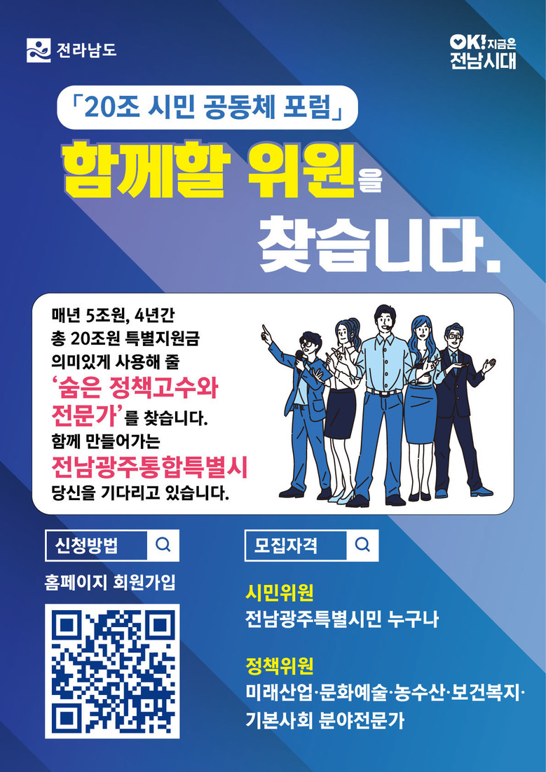20조 시민공동체 포럼 시민·정책위원 참여와 정책 제안은 전남도 누리집(www.jeonnam.go.kr)에서 참여·접수할 수 있다.
