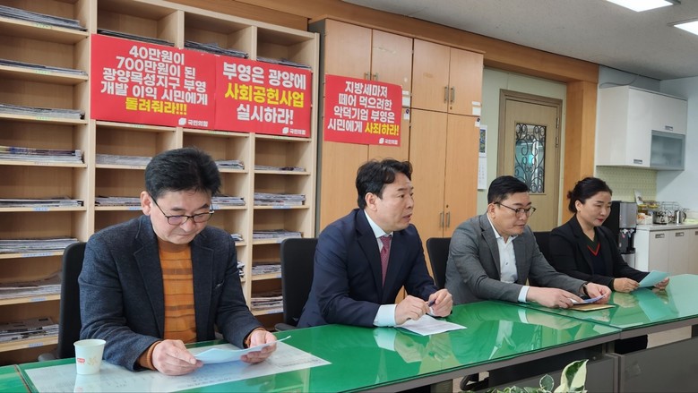 추우용 위원장과 당원들은 이날 광양시청 홍보실 브리핑룸에서 기자회견을 가진 뒤, 성명서를 통해 "부영주택의 목성지구 개발은 광양시와 시민들의 무조건적인 도움으로 시작된 것"이라면서 "빠른 도시 조성 등을 위해 황금뜰로 불리는 최대 노른자 부지를 평당 45~50만 원에 매각하게 된 것"이라고 지적했다.(사진 국민의힘 제공)