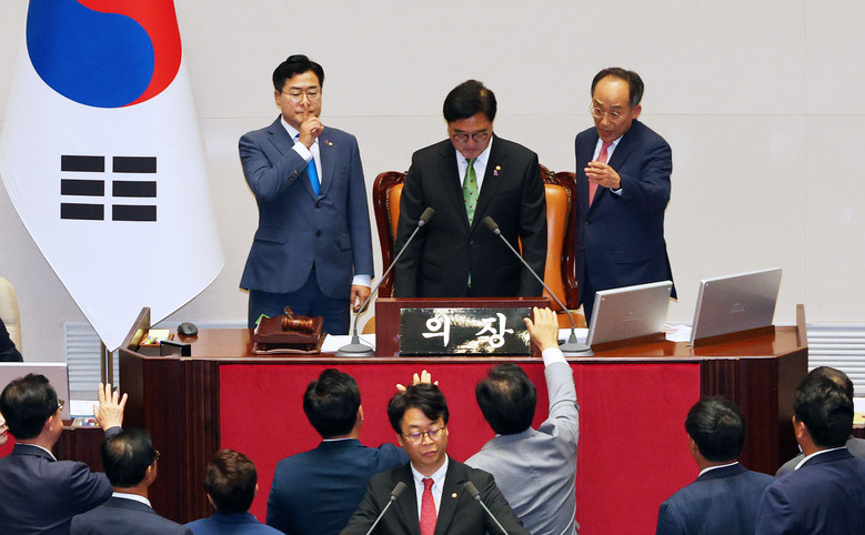 우원식 국회의장은 더불어민주당 요구대로 이날 오후 2시 본회의를 소집한 상태다. 국민의힘은 여야가 합의하지 않은 의사일정이므로 본회의를 열어서는 안 된다는 입장이지만, 민주당 등 야당은 여당 없이도 단독으로 법안 처리를 강행하겠다는 태세여서 충돌이 불가피해 보인다.