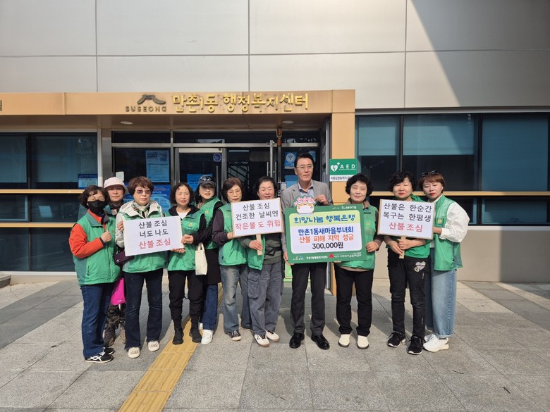 [수성구 세계타임즈=한윤석 기자] 대구시 수성구 만촌1동 행정복지센터(동장 신상백)는 만촌1동 새마을부녀회(회장 박선희)가 최근 대규모 산불로 피해를 입은 영남 지역 주민들을 돕기 위해 성금 30만 원을 대구사회복지공동모금회에 전달했다고 30일 밝혔다.
