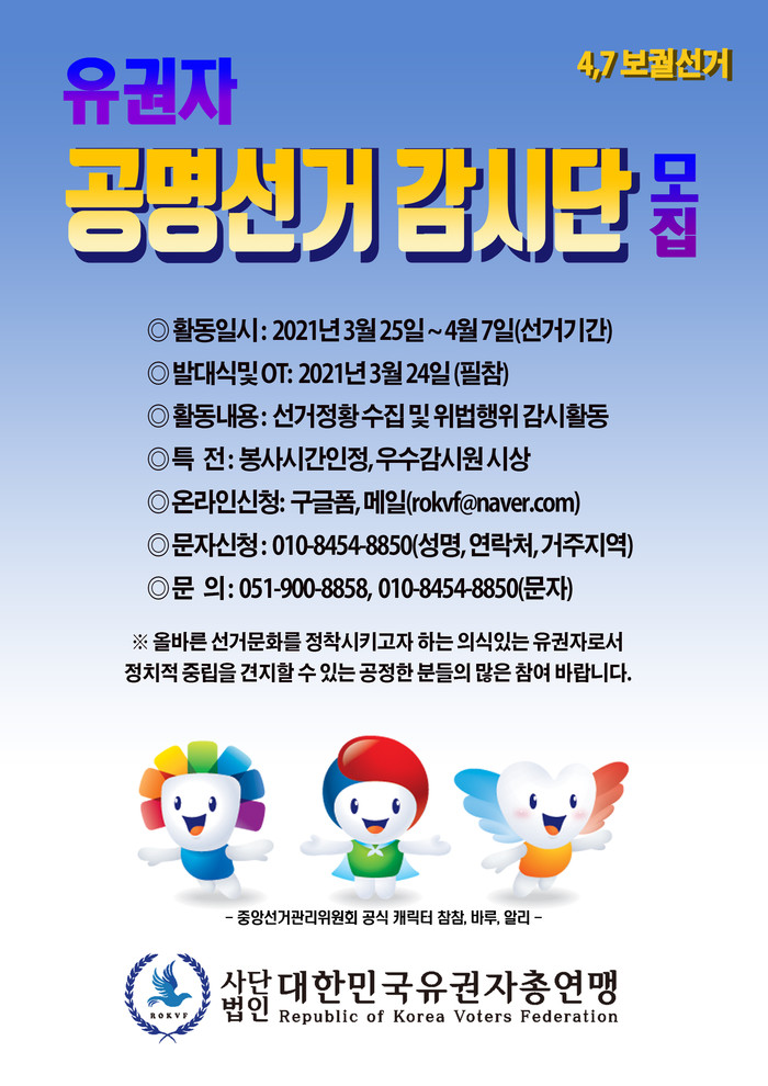 사단법인 대한민국유권자총연맹(대표 김희매, 공동대표 강병령, 이하 연맹)은 부산광역시장 보궐선거에 대비해 24일 오후4시 부산광역시 부산진구 중앙대로 852 (전포동, 부산노인회관) 2층 강당에서 공명선거감시단(이하 감시단) 발대식 및 오리엔테이션을 갖는다고 밝혔다.