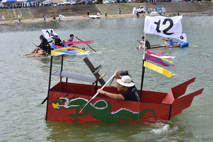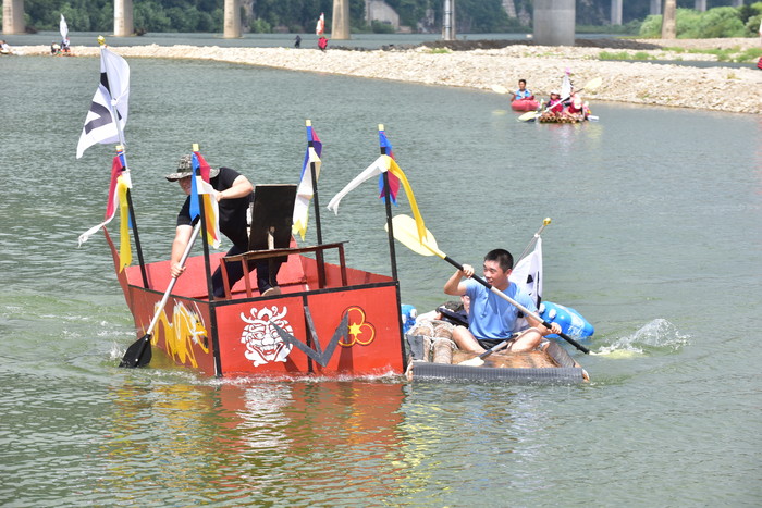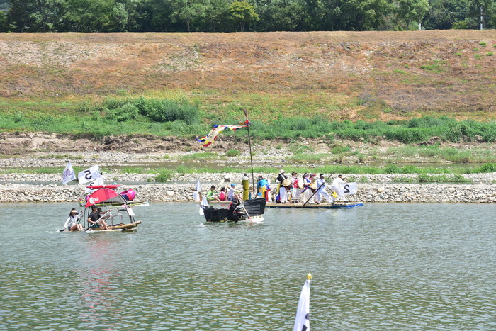 2018 동강뗏목축제의 하이라이트인 동강퓨전뗏목만들기대회 2일차 경기에 참가한 뗏목들이 경주대결을 펼치고 있다.