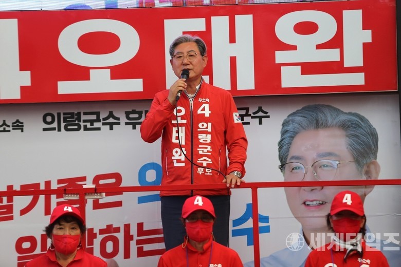 [세계타임즈 = 이진화 기자] 6.1지방선거 마지막날인 31일 오후 부림면 신반전통시장에서 재선에 도전하는 무소속 오태완 경남 의령군수 후보가 지지를 호소하는 유세를 하고 있다.