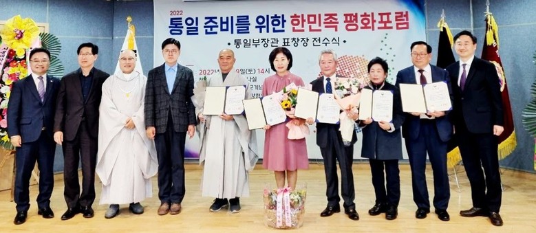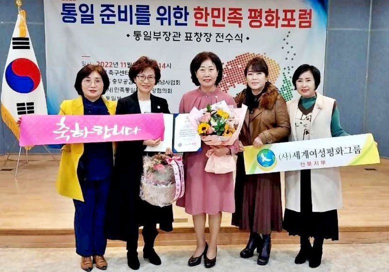 [세계타임즈 = 최준필 기자] ㈔세계여성평화그룹(IWPG) 여미현 전북지부장은 지난 19일 천안 축구센터 대세미나실에서 열린 ‘2022 통일준비를 위한 한민족 평화포럼’ 통일부장관 표창장 전수식에서 통일부장관 표창장을 수상했다.