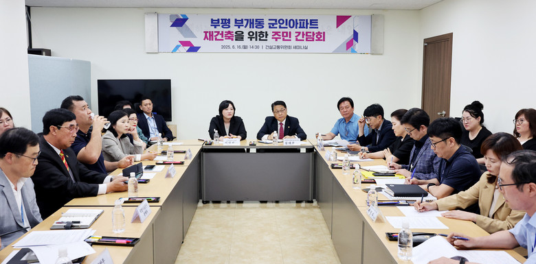 인천시의회 건설교통위원회(위원장 김대중)는 16일 시의회 별관 5층 세미나실에서 김대중 위원장 및 유경희 문화복지위원장, 건설교통위원회 박종혁.이단비 의원, 강유정 인천시 도시계획과장, 국방부 관계자 등이 참석한 가운데 ‘부평 부개동 군인아파트 재건축 관련 주민 간담회’를 개최했다.
