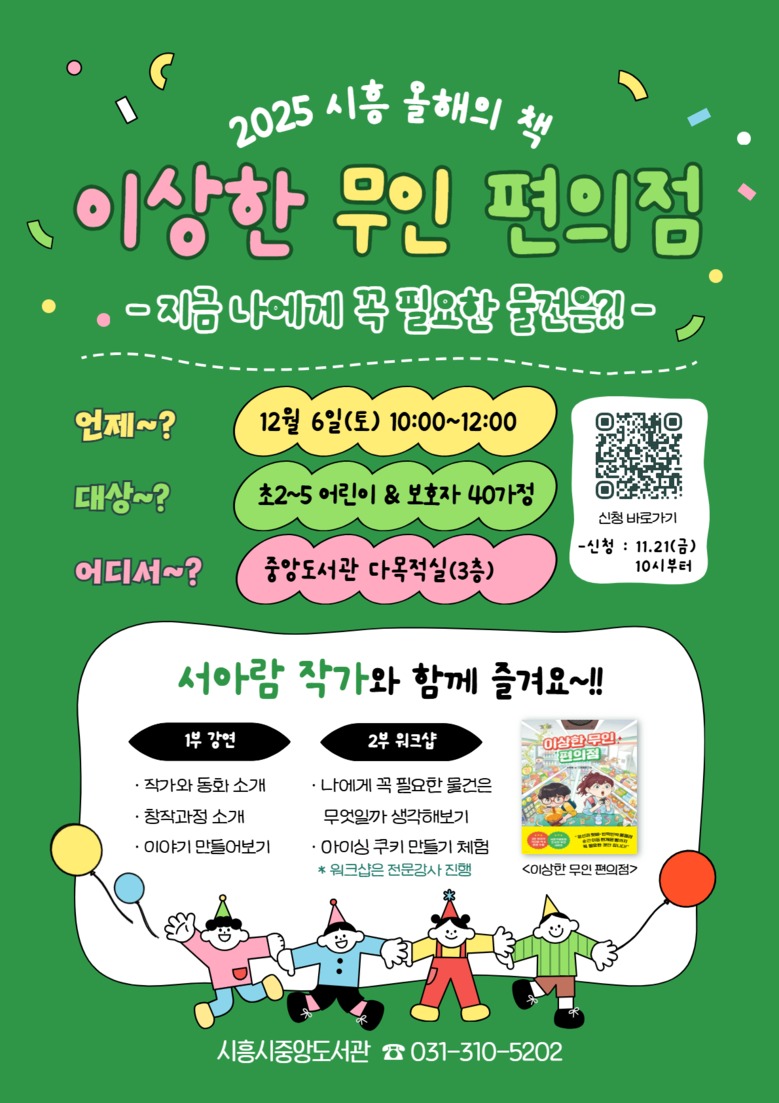 12월 6일 어린이·가족 40가정 대상…스토리 만들기·아이싱 쿠키 체험 포함 [세계타임즈=시흥시 송민수 기자] 시흥시중앙도서관은 ‘2025 시흥 올해의 책’ 어린이 분야 선정 도서인 「이상한 무인 편의점」의 서아람 작가 초청 강연을 오는 12월 6일 오전 10시부터 중앙도서관 다목적실에서 운영한다.