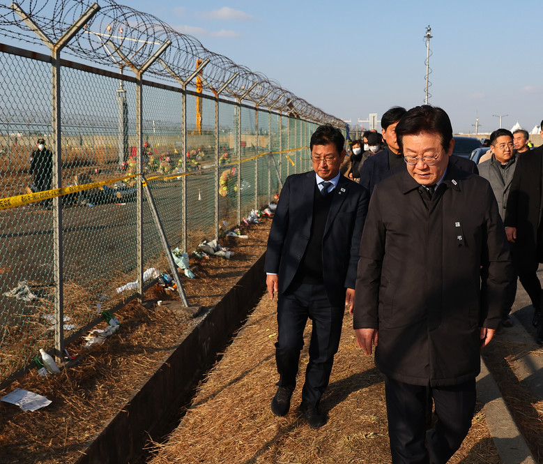 [세계타임즈 = 심귀영 기자] 더불어민주당 이재명 대표가 1일 오후 전남 무안군 무안국제공항 제주항공 여객기 참사 현장 외곽 울타리에서 수색 현장과 시민들이 남긴 추모 물품을 보고 있다. 2025.1.1. 2025.1.1