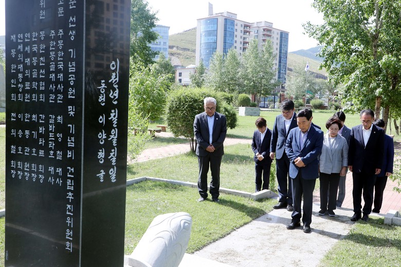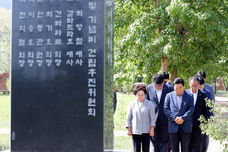 [세계타임즈=충북 이현진 기자] 충청북도의회 박문희 의장과 방문단은 18일 몽골 울란바토르 이태준 선생 기념공원을 방문해 애국정신을 기리는 묵념을 하고 있다.