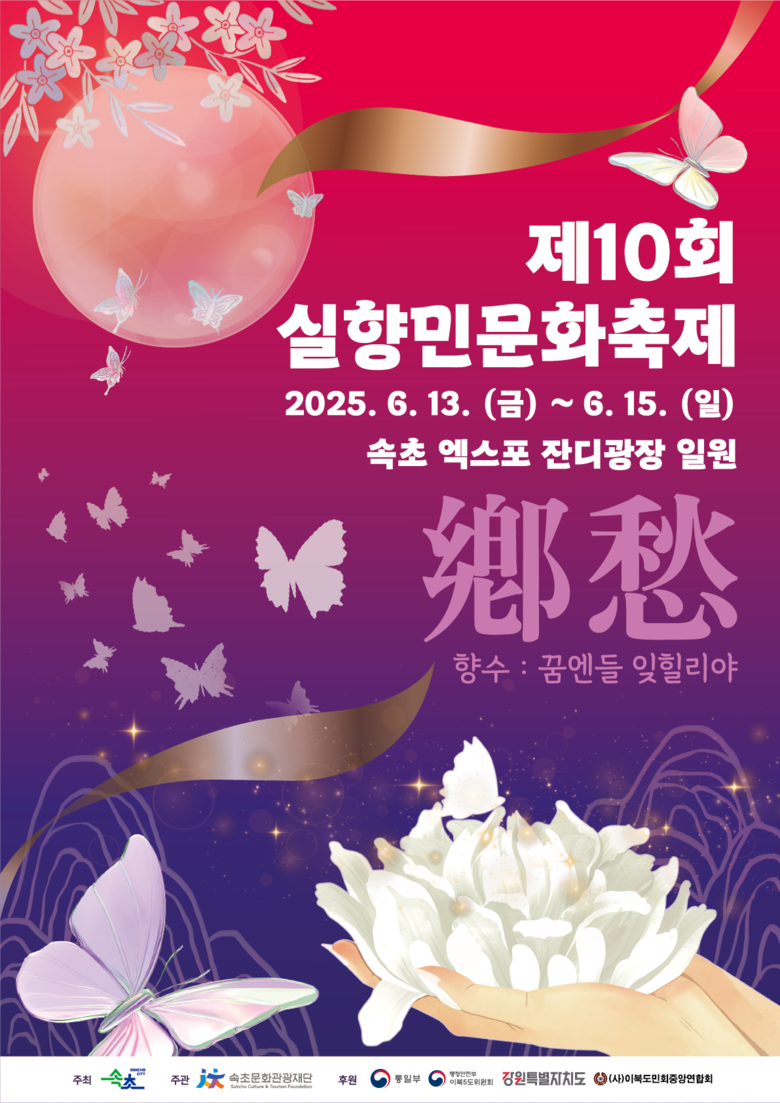 [속초시 세계타임즈=김민석 기자] 속초시와 (재)속초문화관광재단(이사장 이병선 속초시장)은 오는 6월 13일부터 15일까지 3일간 속초 엑스포 잔디광장 일원에서 ‘향수(鄕愁), 꿈엔들 잊힐리야!’를 주제로 제10회 실향민 문화축제를 개최한다.