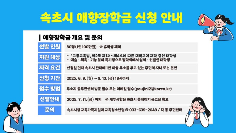 애향장학생 선발과 관련한 자세한 사항은 속초시청 홈페이지(https://www.sokcho.go.kr) 고시·공고란을 참고하거나, 속초시 교육가족지원과(☎639-2049)로 문의하면 된다.