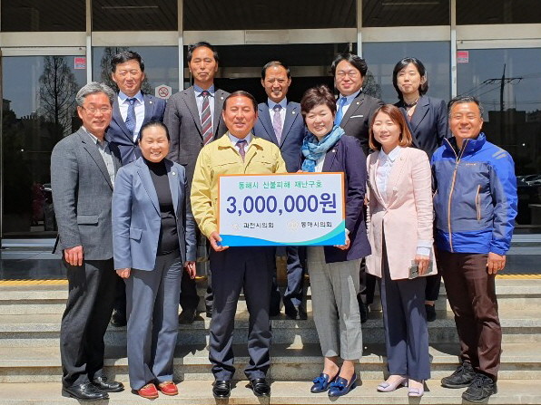 [동해시=세계타임즈 김민석 기자] 과천시의회(의장 윤미현)는 2019년 4월 15일 자매도시인 동해시를 방문하여 산불피해 지원성금을 300만원을 전달하였다.