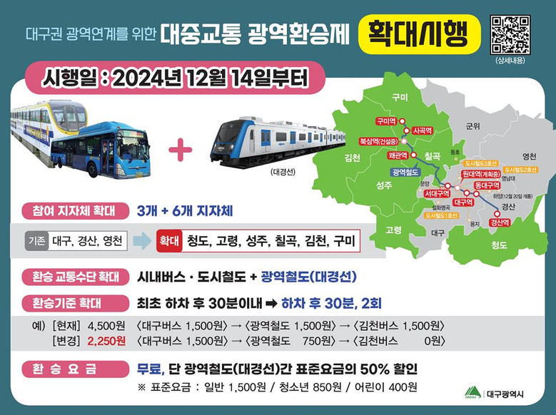 ▸ 시·도민 환승 교통비 50% 절감, 광역환승건수 200% 증가 예상 [세계타임즈=대구 한윤석 기자] 대구광역시는 대중교통 이용활성화와 대구 인근 352만 시·도민의 대중교통 광역환승 교통비 절감을 위해 대구권 광역철도(이하, 대경선) 개통시기(2024.12.14)에 맞춰, 대중교통 환승 서비스 지역을 대폭 확대한다.