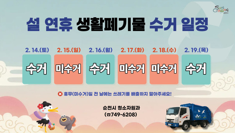 설 연휴 기간 종량제 및 재활용, 음식물쓰레기 등 생활폐기물은 14일과 16일에 정상적으로 수거된다. 다만, 설날 당일인 17일 화요일과 18일 수요일은 수거하지 않는다. 수거하지 않는 전날은 배출 자제를 당부했다.