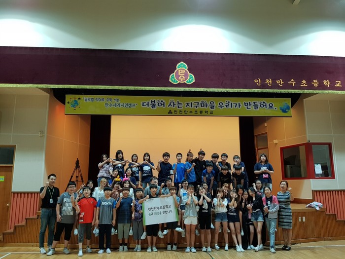 인천만수초등학교는 매년 아이들을 글로벌 시민으로 성장할 수 있도록 세계시민캠프를 진행하였으며 올해도 행사진행과 함께 교내 바자회를 개최하여 지진과 쓰나미로 고통 받고 있는 인도네시아 주민들을 위한 긴급구호 성금으로 전달했다.