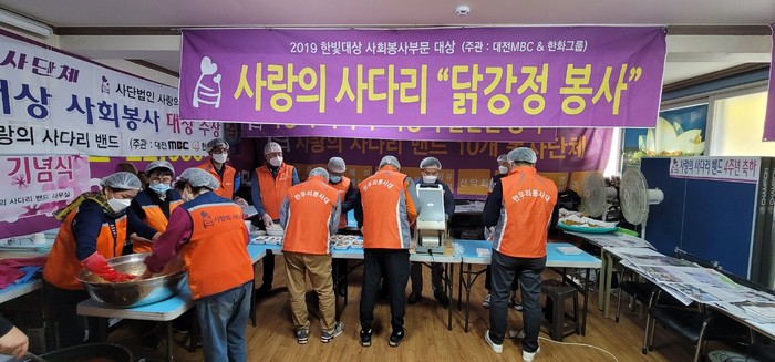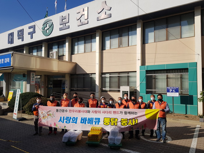 [대전=세계타임즈 이채봉 기자] 대전광역시 SNS 일만명 봉사단체 사랑의 사다리 밴드(리더 이정제)는 17일 오전9시~오후1시에 대덕구 신일동에 위치한 ㈜동건운수 한우리 봉사대(회장 이태석)의 후원으로 대덕구 보건소에 닭강정 120개 전달로 우리 사회의 따뜻한 사랑을 실천 하였다.