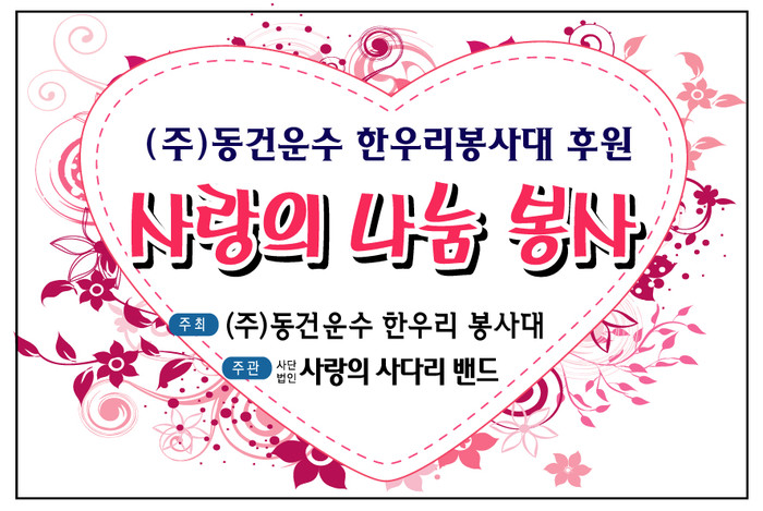 이날 닭강정 봉사는 ㈜동건운수 한우리 봉사대 이태석 회장, 윤상섭 조합장, 지상욱 부장 등 직원15명과 사랑의 사다리 밴드 유희자 단장을 비롯한 회원 10명이 닭강정을 약 4시간동안 정성을 다해서 만들고 전달을 하였다.