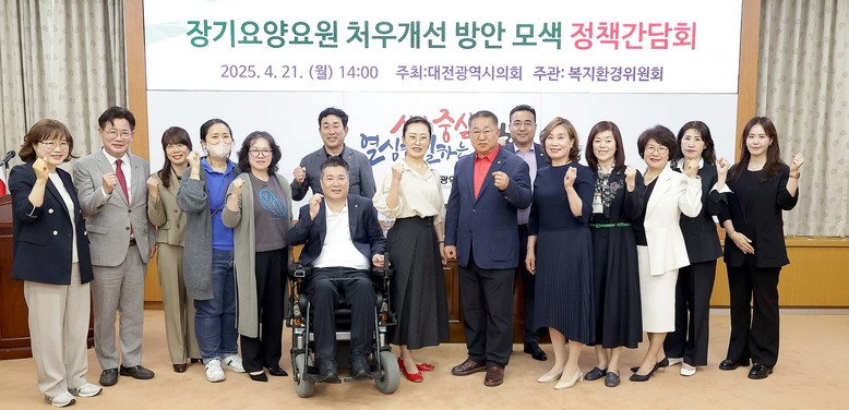 [대전 세계타임즈=이채봉 기자] 대전시의회 복지환경위원회가 21일 시의회 소통실에서 이한영 의원(국민의힘, 서구6)을 좌장으로 ‘장기요양요원 처우개선 방안 모색 정책간담회’를 개최하고 대전광역시 노인복지 서비스 수준을 높이기 위한 장기요양요원의 복지증진 및 지위향상 방안 마련에 나섰다.