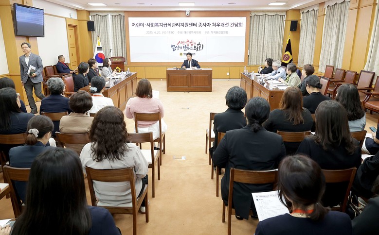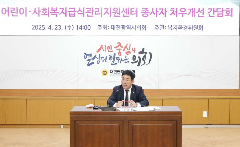 [대전 세계타임즈=이채봉 기자] 대전시의회가 23일 의회 소통실에서 ‘어린이·사회복지급식관리지원센터 종사자 처우개선 간담회’를 열고 센터 종사자들의 근무 환경과 처우 개선 방안을 논의했다.