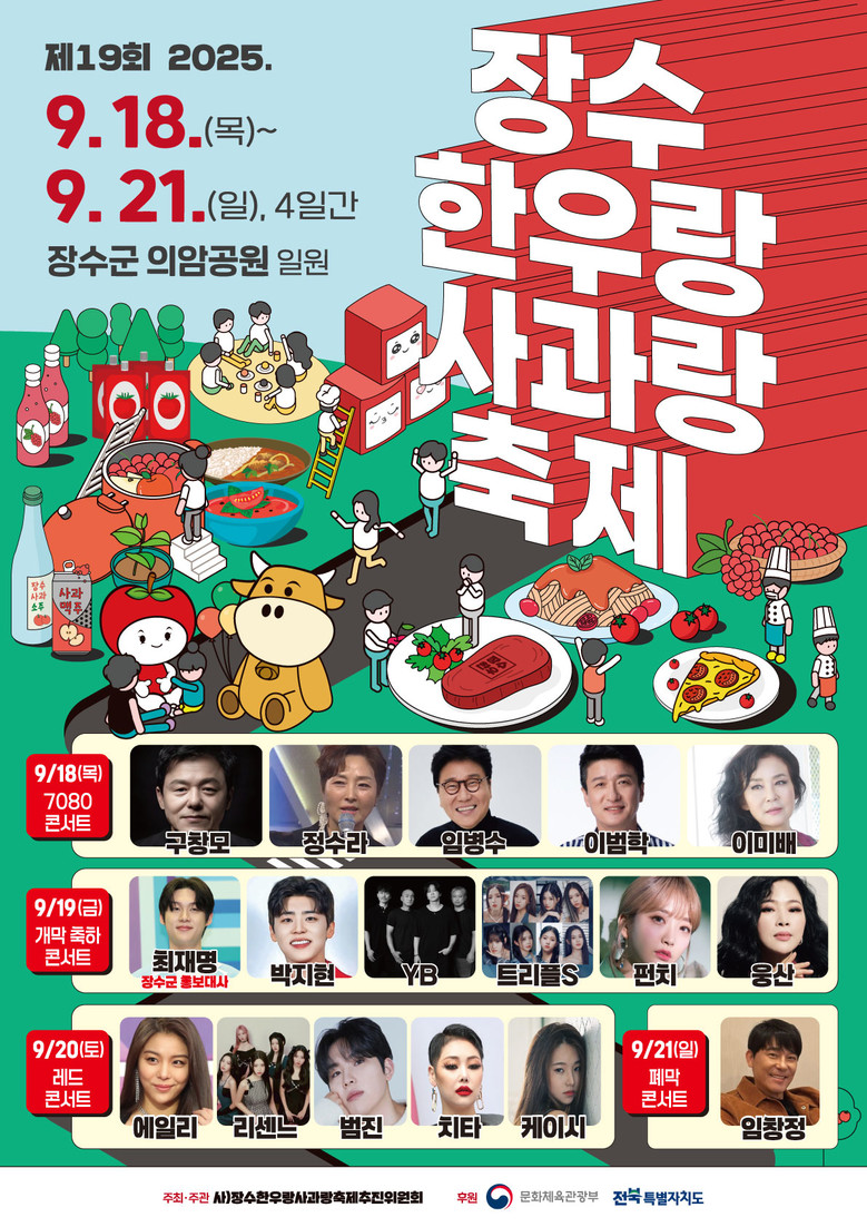 한편 장수군 대표축제 ‘제19회 장수 한우랑 사과랑 축제’는 지난해 제18회 축제 때 약 30만 명이 온·오프라인으로 참여하며 전북 최대 규모의 축제로서 명성을 입증했고 3년 연속 전북특별자치도 최우수축제 선정되는 등 장수군의 브랜드 가치를 높이고 지역경제 활성화에 크게 기여하고 있다.