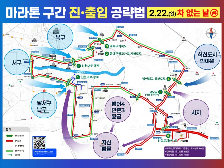 ▸ 대구시 홈페이지에서 통제구간·우회도로 안내… 사전 확인 필수 [세계타임즈=대구 한윤석 기자] 대구광역시는 2026대구마라톤 대회가 열리는 2월 22일(일)을 ‘차 없는 날’로 운영한다. 참가자들의 안전을 위해 시민들께서는 가급적 차량이 아닌 도시철도 등 대중교통을 이용하거나 불가피하게 차량을 운행할 경우 미리 우회도로를 확인해 줄 것을 권장한다.