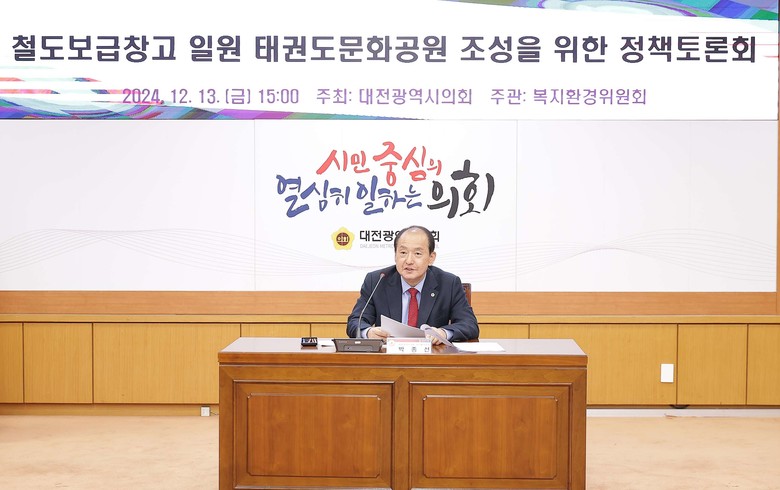 복지환경위원회 박종선 의원(국민의힘, 유성구1)이 좌장을 맡은 이번 토론회에서 대전역 인근 철도보급창고(국가등록문화유산 제168호) 일원을 태권도문화공원으로 조성하기 위한 제도적·정책적 방안이 제기돼 관심을 모았다.